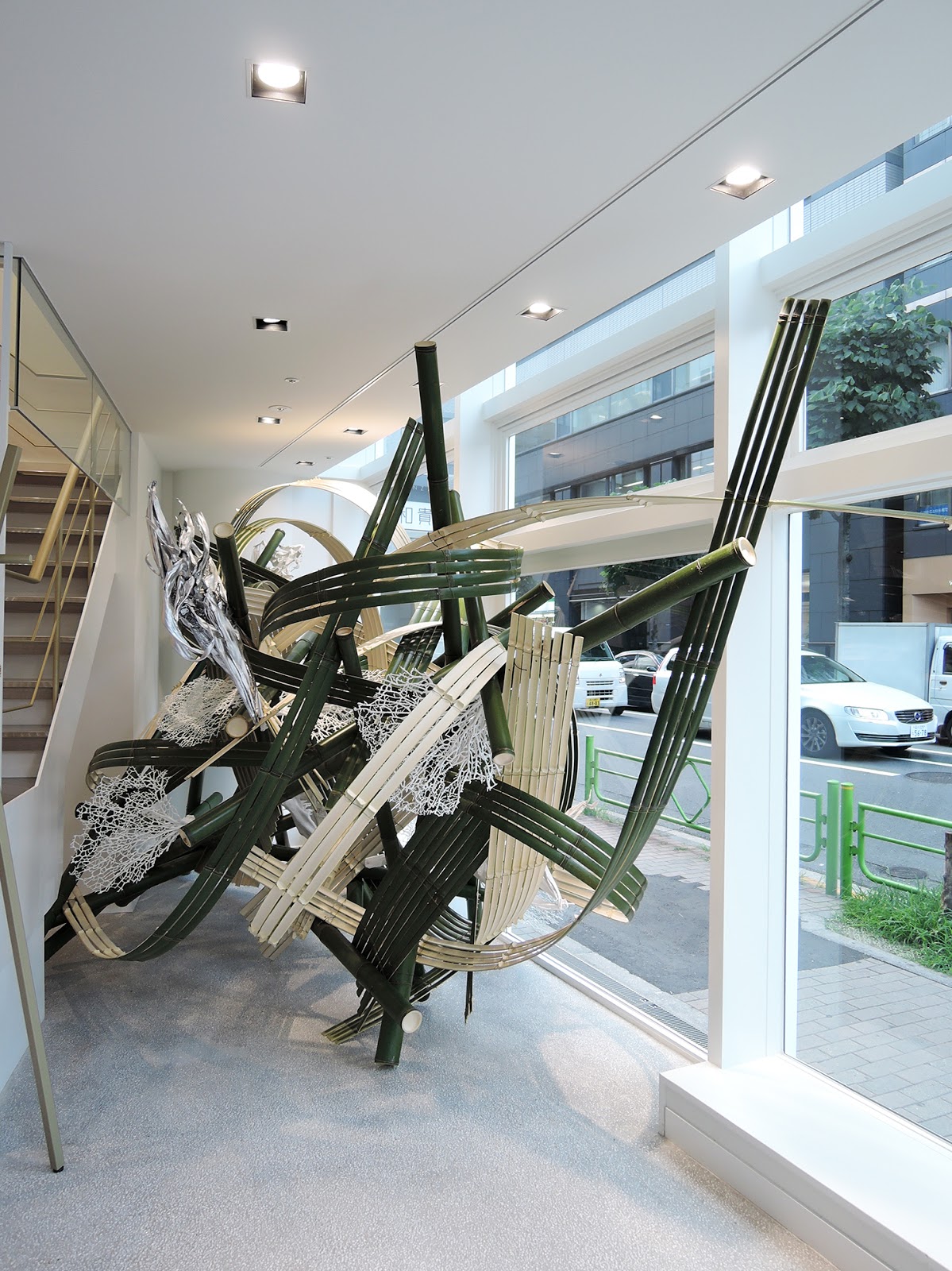 真っすぐに丸竹を立てて、割竹の帯としゃりぼくを浮かせて構成しました。