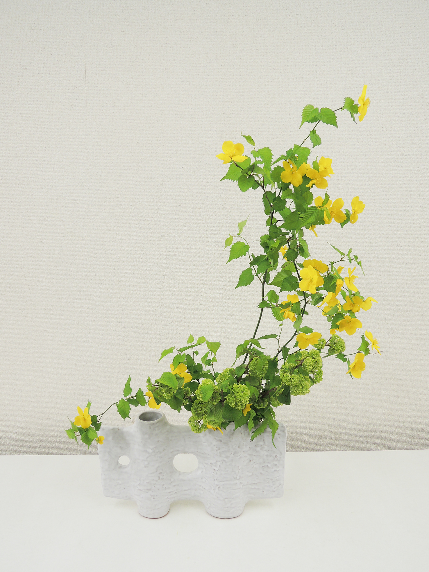花材:シャクナゲ、ねこやなぎ、ラナンキュラス